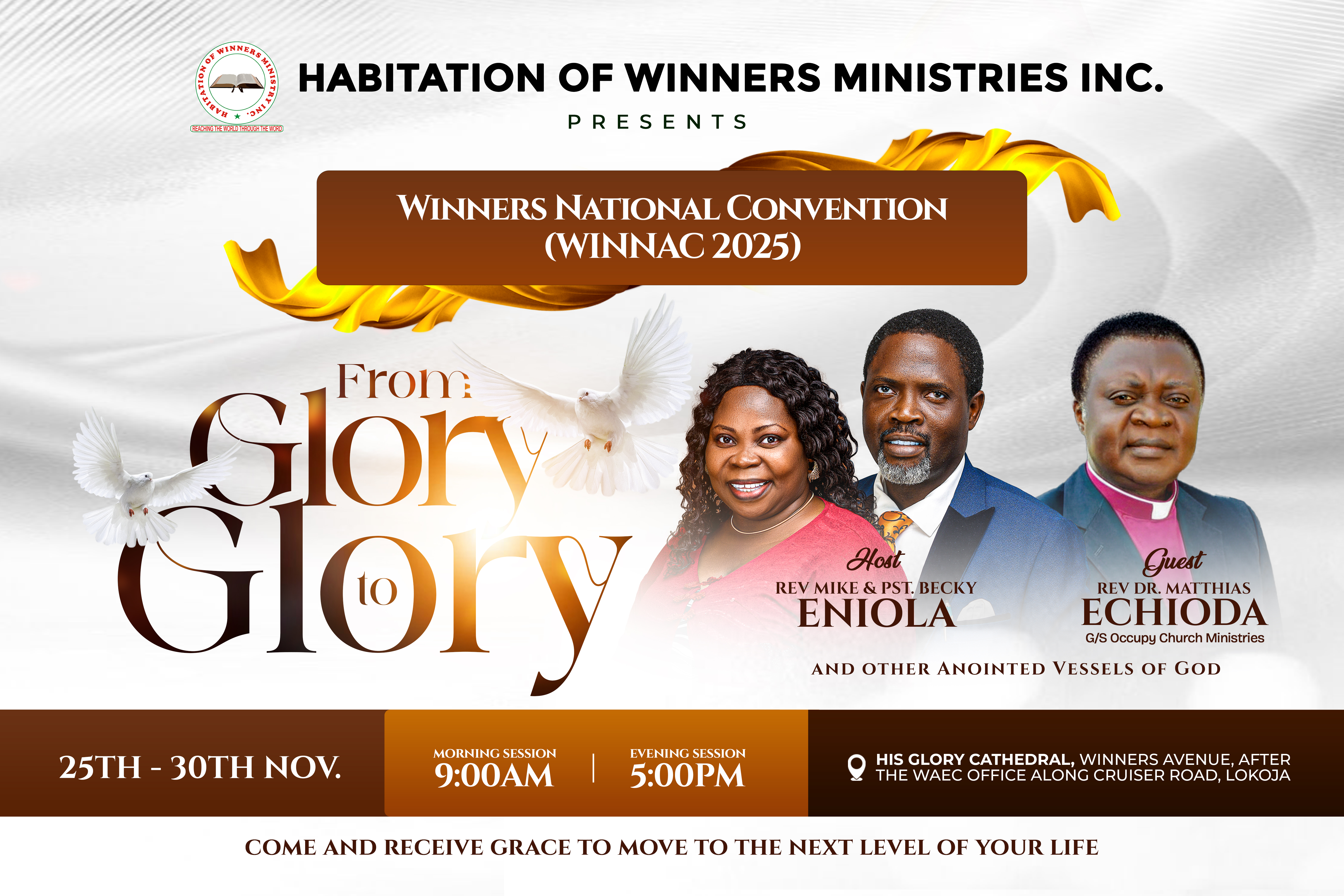 WINNAC 2025🎉🎉🎉🥳 WINNAC is an annual program established as our national convention which commemorates the rooted word of God, launches and prepares us for our next level and year ahead. This highly anticipated glory, would be featuring our father Rev. Mike Eniola, Pst Becky Eniola and several anointed vessels of God. Come and take a turn, transition and settlement of from Glory to glory. Do not forget to come with your white handkerchief serving as a symbol of glorious praise. It is essential as a member to support the program with our prayers, finance, presence and stewardship. You will not be found missing🙏 God bless you, Shalom❤️